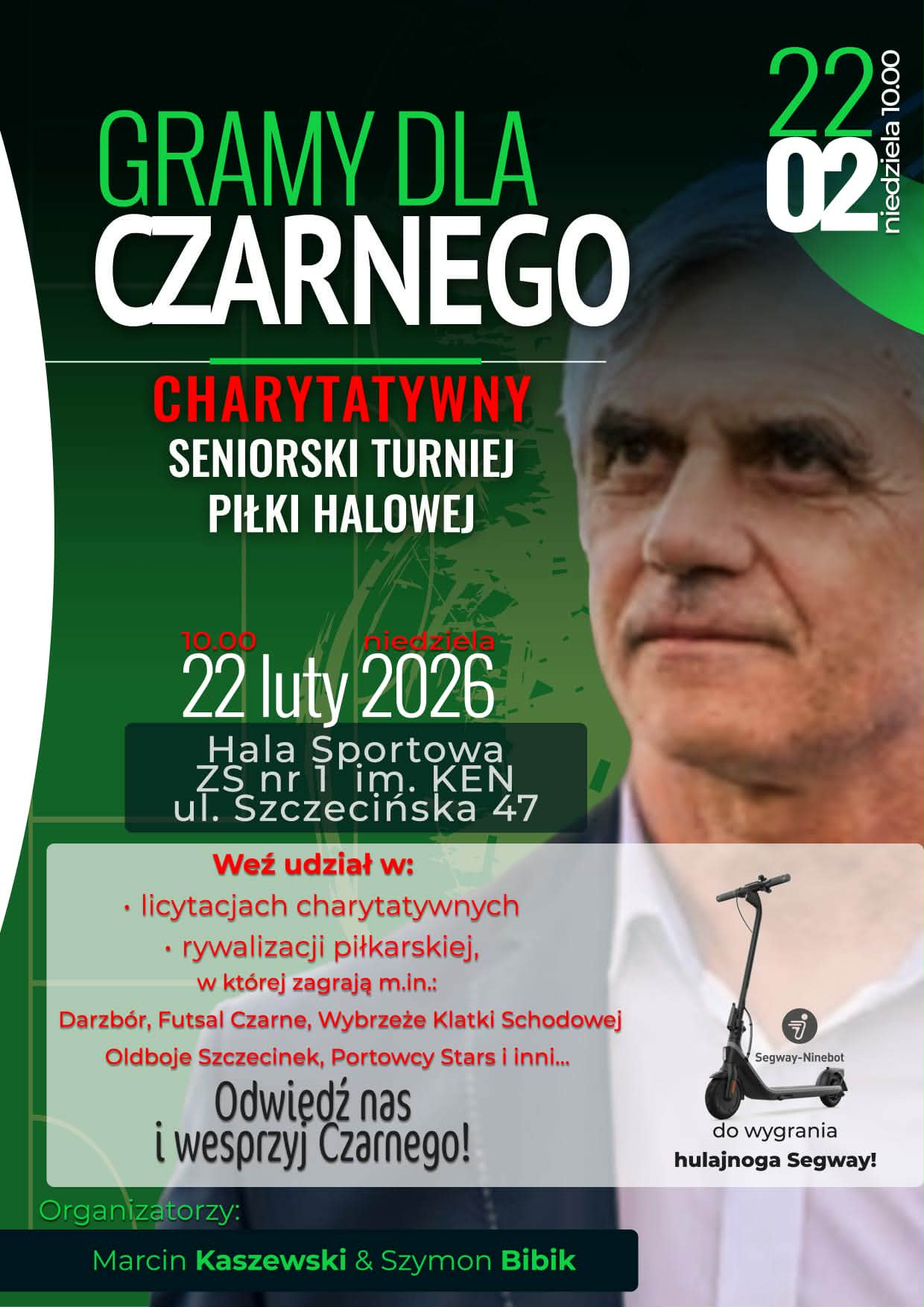 W hali ZS nr 1 w Szczecinku rozegrany zostanie turniej charytatywny GRAMY DLA CZARNEGO. Ma on na celu wsparcie byłego trenera Darzboru Szczecinek oraz AP Szczecinek, który obecnie przebywa w hospicjum. Oficjalne rozpoczęcie turnieju w niedzielę o godzinie 10:00, ale początek zmagań już od godziny 9:00. Czas gry 7 minut, później 3 minuty przerwy (albo 8 minut i 2 minuty przerwy ). Na początku gra grupa A, w której wystąpią następujące drużyny: Darzbór Szczecinek, Oldboje Szczecinek, Państwowa Straż Pożarna w Szczecinku, Futsal Czarne, Kultywator Omulna, Błękitni Gonne Małe. O 11:15 pierwszy blok licytacji. Do wylicytowania będą koszulki piłkarskie, m.in. Reprezentacji Polski z autografem selekcjonera Jana Urbana, a także Legii Warszawa, Lecha Poznań, GKS-u Katowice, Górnika Zabrze, Stali Rzeszów, Miedzi Legnica i wiele innych. Oprócz koszulek vouchery do szczecineckich restauracji, salonów urody oraz na różnorakie usługi. Poza tym książki z autografami, pióra, kosze prezentowe. Będzie w czym wybierać! O 12:10 rozpoczynamy zmagania w grupie B. W niej zagrają: Portowcy Stars (drużyna złożona z byłych piłkarzy Pogoni Szczecin na czele z Olgierdem Moskalewiczem), Footballprogress, Wybrzeże Klatki Schodowej, OCR Ninja, Technikum Leśne Warcino i Starzy Wyjadacze. O 14:00 drugi blok licytacji. Od 15:10 mecze półfinałowe i mecz o III. miejsce. 15:40 – losowanie nagrody głównej – hulajnogi elektrycznej Segway Ninebot E2. Przez cały turniej będzie można pozyskać cegiełki, które następnie wezmą udział w losowaniu nagród. Oprócz tego można wesprzeć leczenie Janusza Leszko wrzucając pieniądze do puszek i kupując wypieki przygotowane przez Stowarzyszenie Aktywnych Kobiet. Już teraz dziękujemy też za wszelakie wsparcie dla Serce Szczecinka.  W granicach godziny 15:50 mecz finałowy, zakończenie imprezy i wręczenie pucharów
